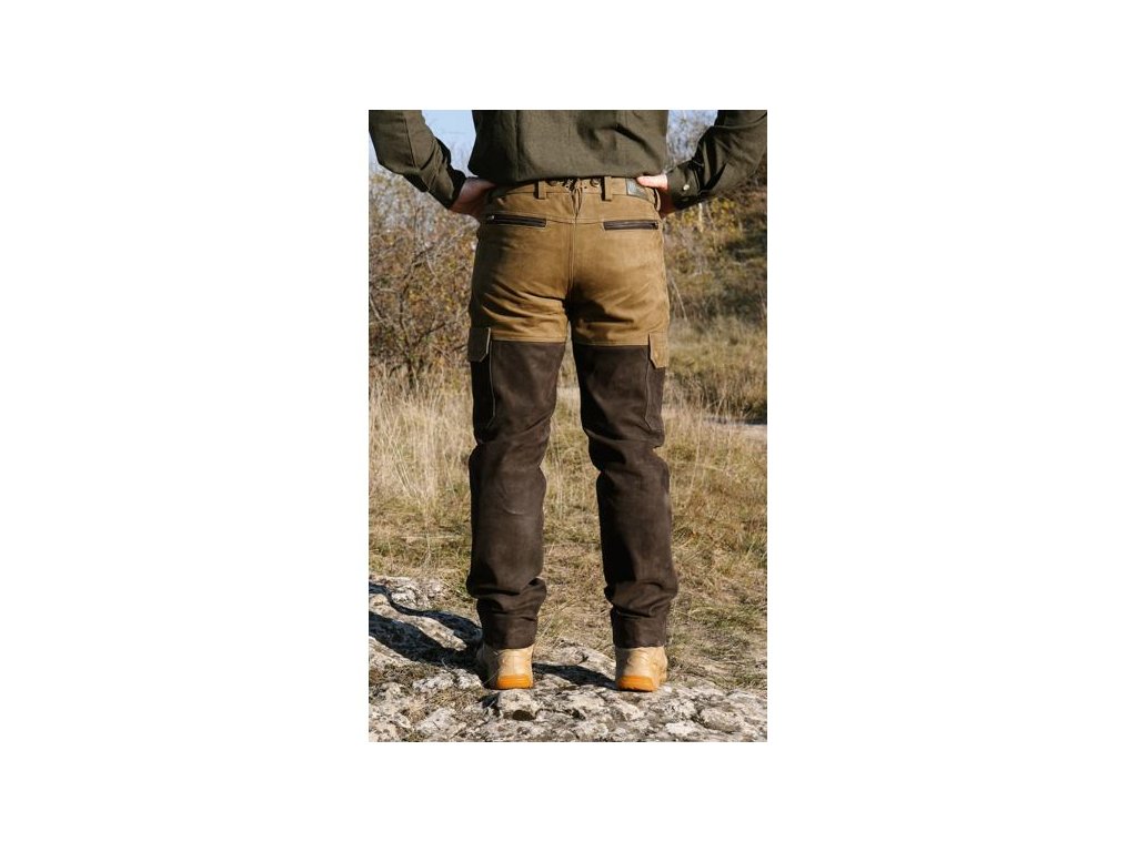 Vypracované lovecké kožené kalhoty z pevné, robustní kůže, vypodšívkované (100% polyester) téměř po celé délce. Kožené kalhoty mají v  pase zapínání na dva pevné knoflíky. Délka se upravuje jednoduchým zastřižením.