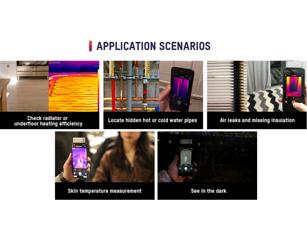 Termovizní modul HIKMCRO Mini pro chytré mobilní telefony umožňuje měření teploty pokožky, inspekce elektrických zařízení, detekci poruch klimatizace nebo vytápění nebo hledání zahřátých objektů ve tmě. Svým rozsahem měření teplot od 5°C do 100°C vyhovuje většině běžných scénářů použití.